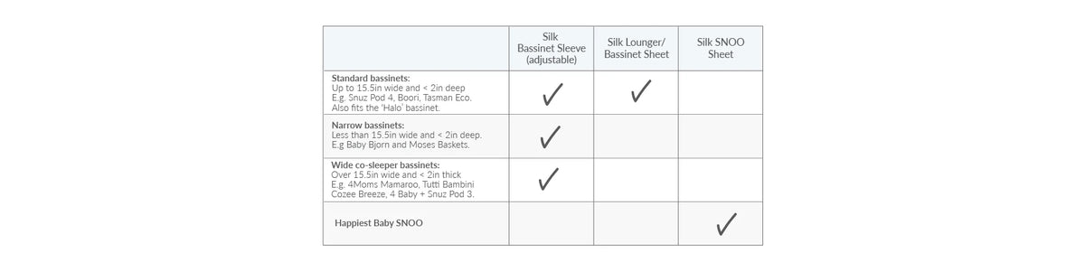 Not to be used on: Narrow bassinets (e.g. the ‘Snoo’) or extra wide bassinets (e.g. Next2Me or other co-sleepers).