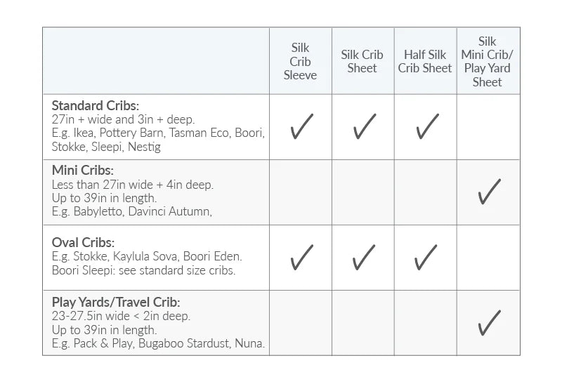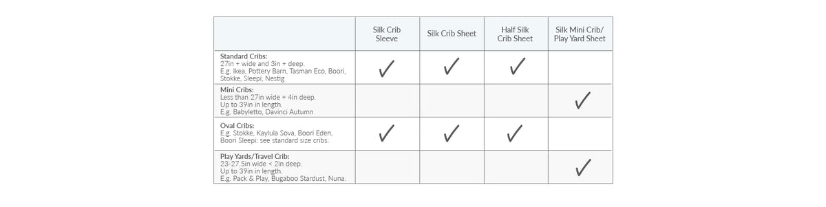We have 5 options for Cots: Silk Crib Sleeves, Silk Crib Sheets (half + full silk) and our Mini Crib/Play Yard Sheets in Half + Full Silk.