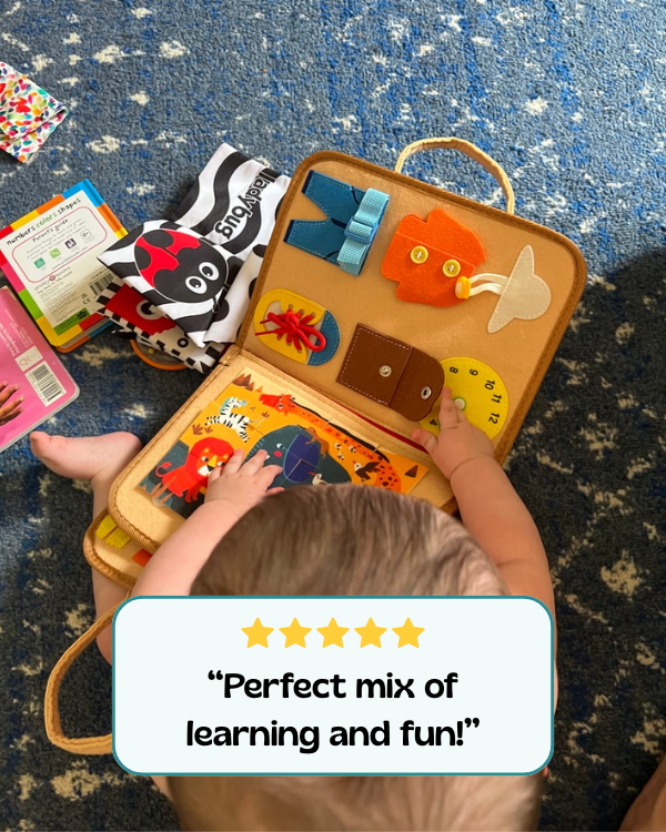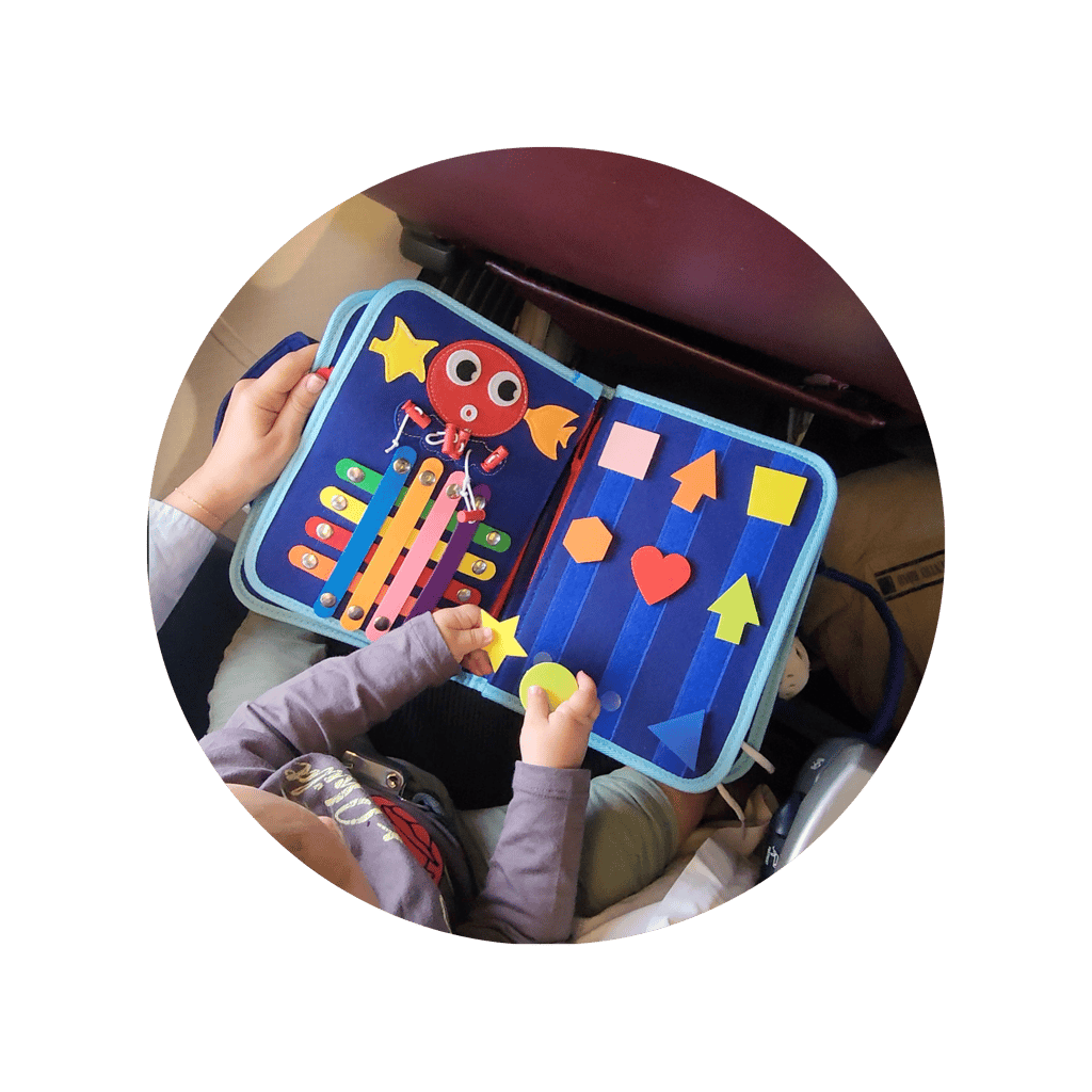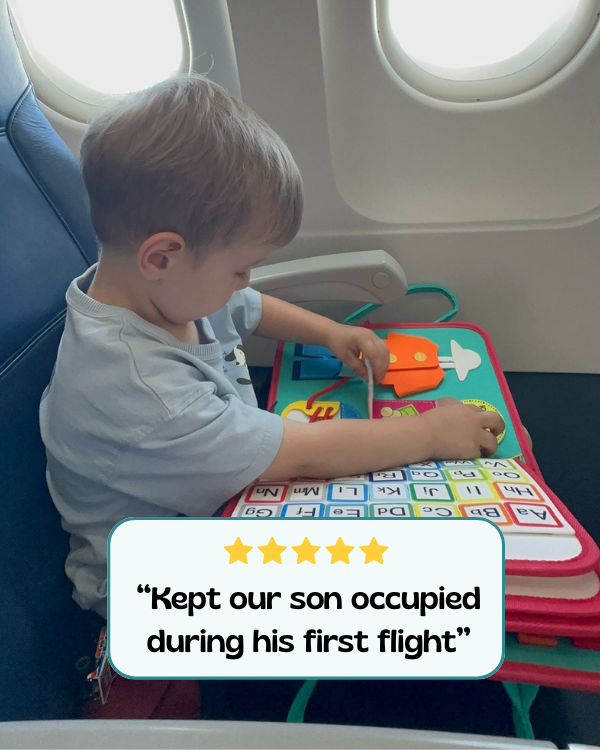 The busy board measures 28 Γ 25 cm (β11 Γ 9.8 inches) and weighs just 0.77Β lbs (0.35 kg). Itβs lightweight, slim, and designed to fit easily into most diaper bags or school bags β making it the perfect travel companion for road trips, flights, or everyday outings.